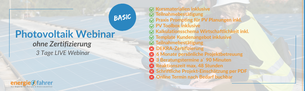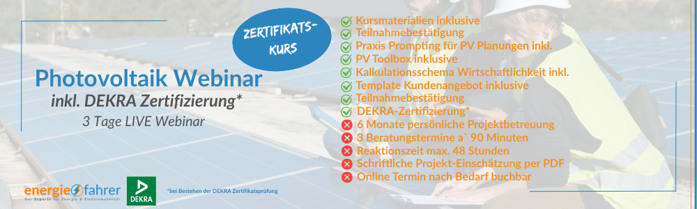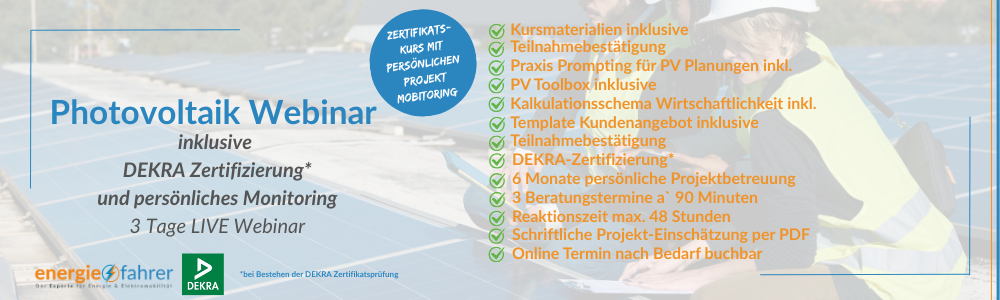 Unser LIVE-Webinar „DEKRA zertifizierte/r Projektmanager/in Photovoltaik" qualifiziert Sie zum Experten für das professionelle Management von PV-Projekten. In drei intensiven Kurstagen erwerben Sie praxisrelevantes Wissen – vom regulatorischen Rahmen über technische Systemintegration bis zu wirtschaftlichen Betreibermodellen.